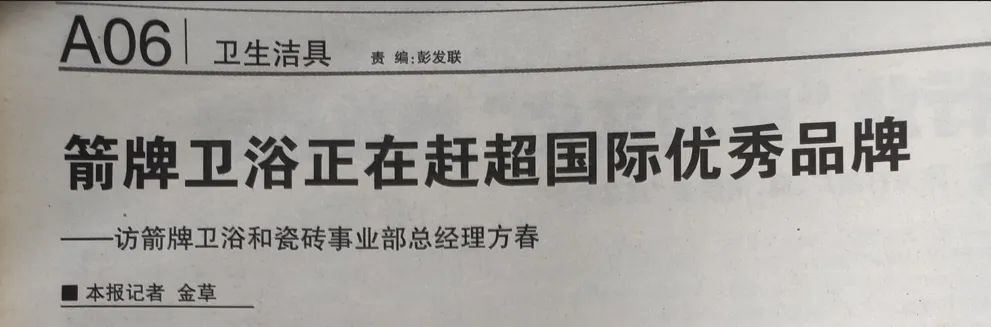 2008年,陶瓷行業權威媒體《陶瓷資訊》刊發《箭牌衛浴正在趕超國際品牌》,文中描述:在陶瓷行業高歌猛進的2007年,我們經常聽到我國衛浴行業的領導品牌-箭牌衛浴產品價格提升仍然供不應求的消息,聽到經銷商提貨難的抱怨,聽到他們投產墻地磚實現產品配套的消息。每次經過箭牌衛浴展廳和倉庫總是看到車水馬龍、排隊提貨的盛況。