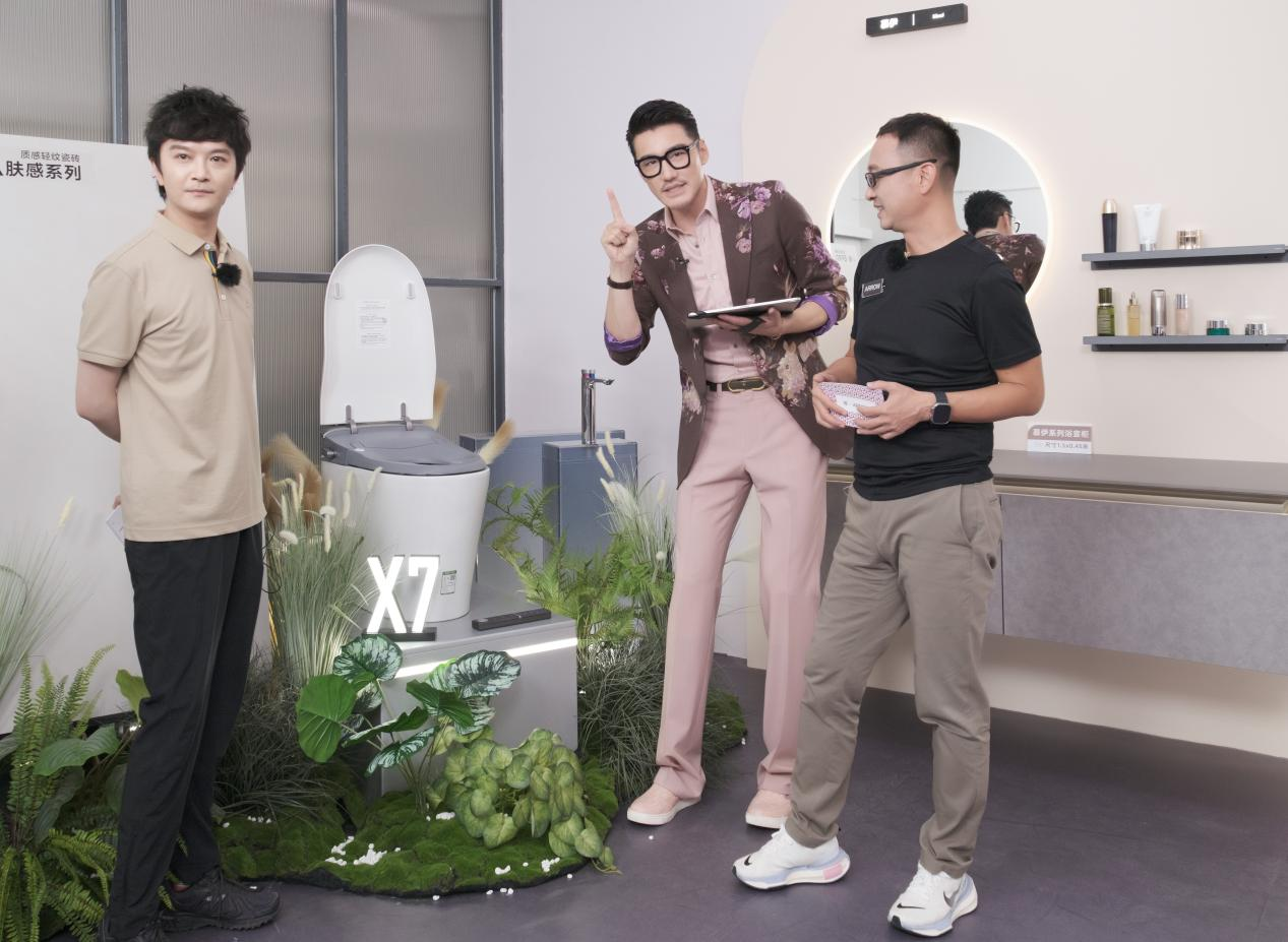 有顏有智,盡顯品味格調的箭牌智能馬桶 X7-AKB1332;精確檢測,呵護健康的箭牌智能尿檢馬桶AKB1621-A;雨淋式頂噴、SPA級手持噴頭,帶來全方位守護沐浴幸福感的Eason系列恒溫花灑;擁有純粹質感,帶來超級視覺享受的慕伊系列浴室柜……這些智慧新品一經發布,即成爆款,在直播間里頻頻收獲訂單與好評。隨后,箭牌瓷磚事業部龔總經理介紹并發布了絨·石PRO系列瓷磚新品,瓷磚以人文紋理筑詩意空間,勾勒出生活優雅,頗得時尚男神胡兵的親睞。